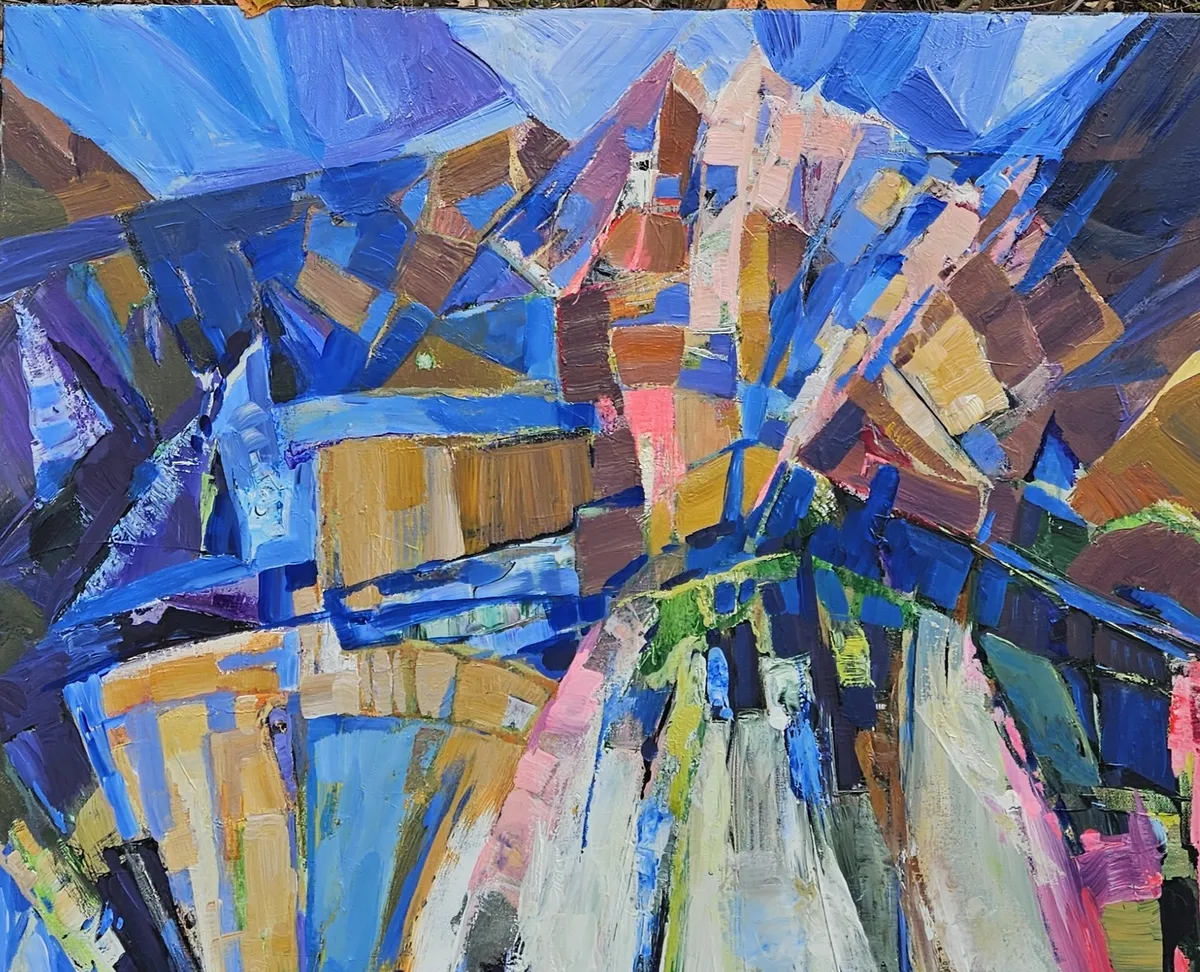 At Dawn, the world holds its breath — suspended between stillness and awakening. Hints of a city or a mountain ridge emerge through translucent layers of blue, rose, and ochre, as light begins to unfold across the surface. Built with palette knife and layered acrylics, the texture reflects both motion and calm — the quiet energy of a day being born. Finished with a satin varnish that protects and softly enhances the luminosity of color.