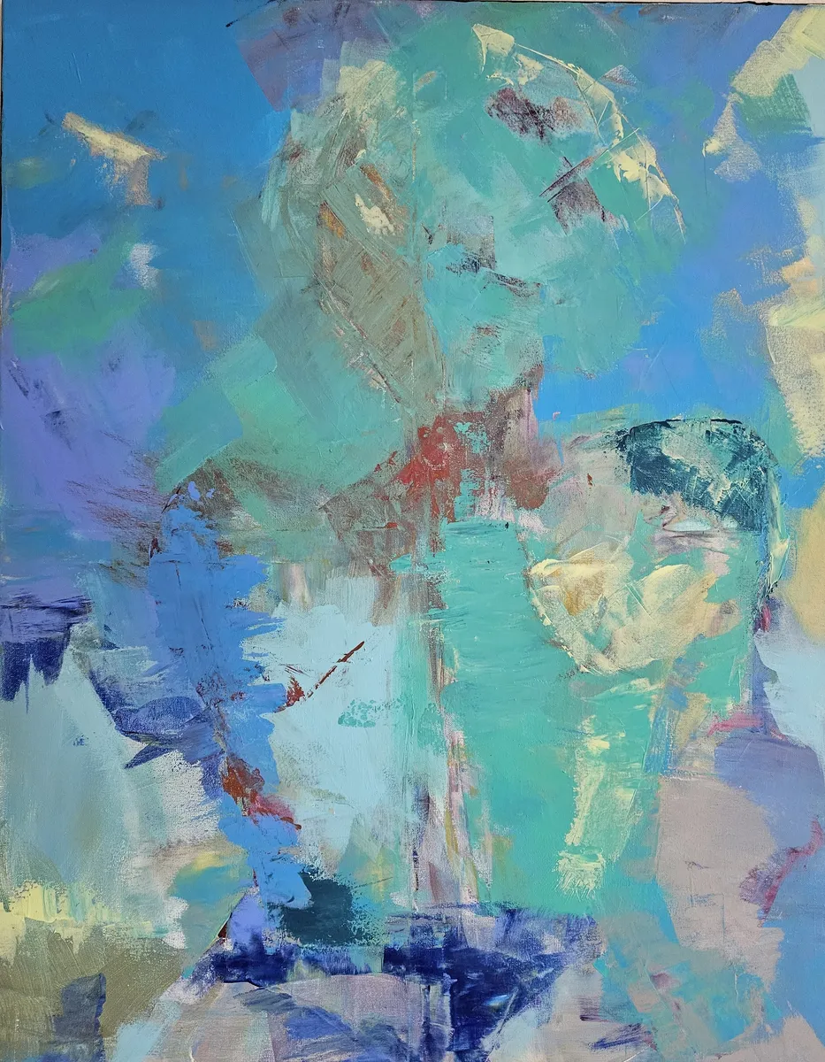 “Presence” is an abstract exploration of human essence — the silent energy that remains even when form dissolves. Through layers of turquoise, lilac, and soft golden hues, the figure emerges and fades, hovering between visibility and abstraction. The painting conveys stillness and emotional depth, inviting the viewer to sense rather than see — to feel the quiet pulse of existence itself. Created in expressive, intuitive gestures, “Presence” captures the fragile balance between being and becoming, between light and shadow, between the tangible and the unseen. Dominant colors: Turquoise, aqua, lilac, soft gold, violet