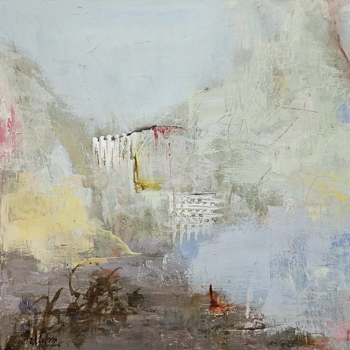 On the Edge of Balance - This painting belongs to a series inspired by my memories of Japan. It reflects the atmosphere, color palette, and emotional impressions that those moments left with me.... explores the fine line between presence and disappearance. The composition hovers in a quiet tension — where movement is barely about to begin, or perhaps has just ended. Subtle textures, veiled layers, and pale tones suggest a landscape that is both within and beyond perception. This painting invites reflection on the unstable nature of balance itself: how even calmness contains motion, and how the act of holding steady is always alive. Finished with a satin varnish that protects the surface and enhances its soft luminosity.