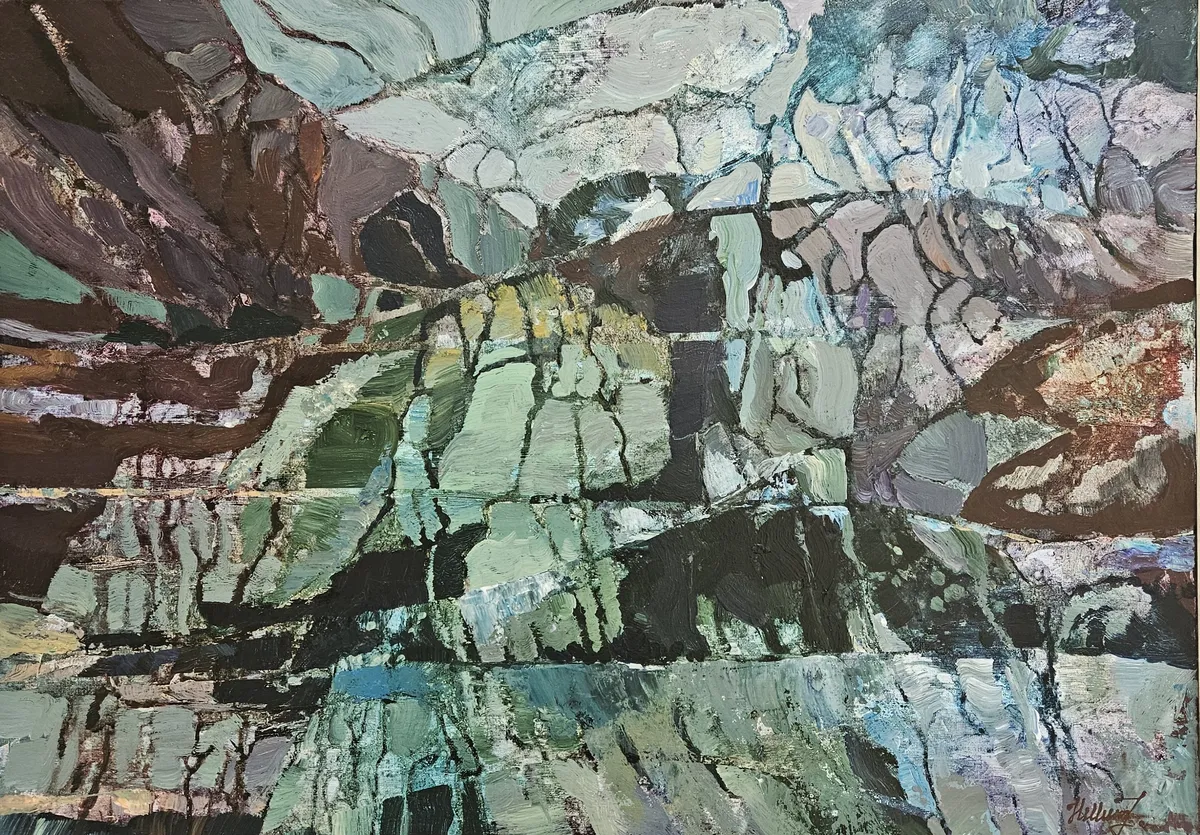 Mountains That Remind is a meditation on memory held within matter. The forms rise and fracture like thoughts surfacing from deep silence — reminders not of what has passed, but of what endures. The painting transforms geological layers into emotional strata, suggesting that everything we experience leaves an imprint, visible or not. Its structure oscillates between solidity and transparency, between remembering and release. The work is finished with a satin varnish, enhancing the depth of color and preserving the natural matte–glow balance of the surface.